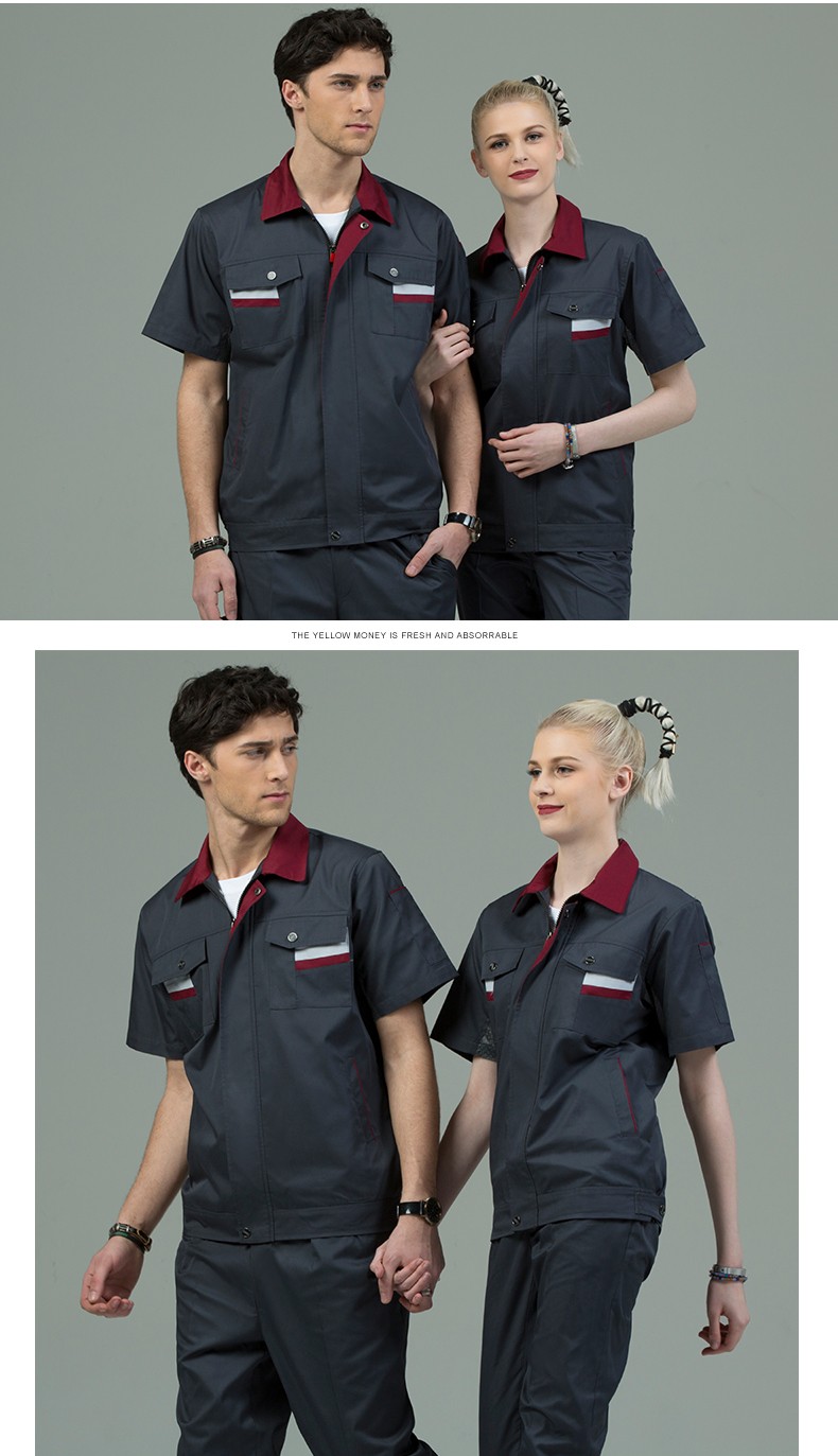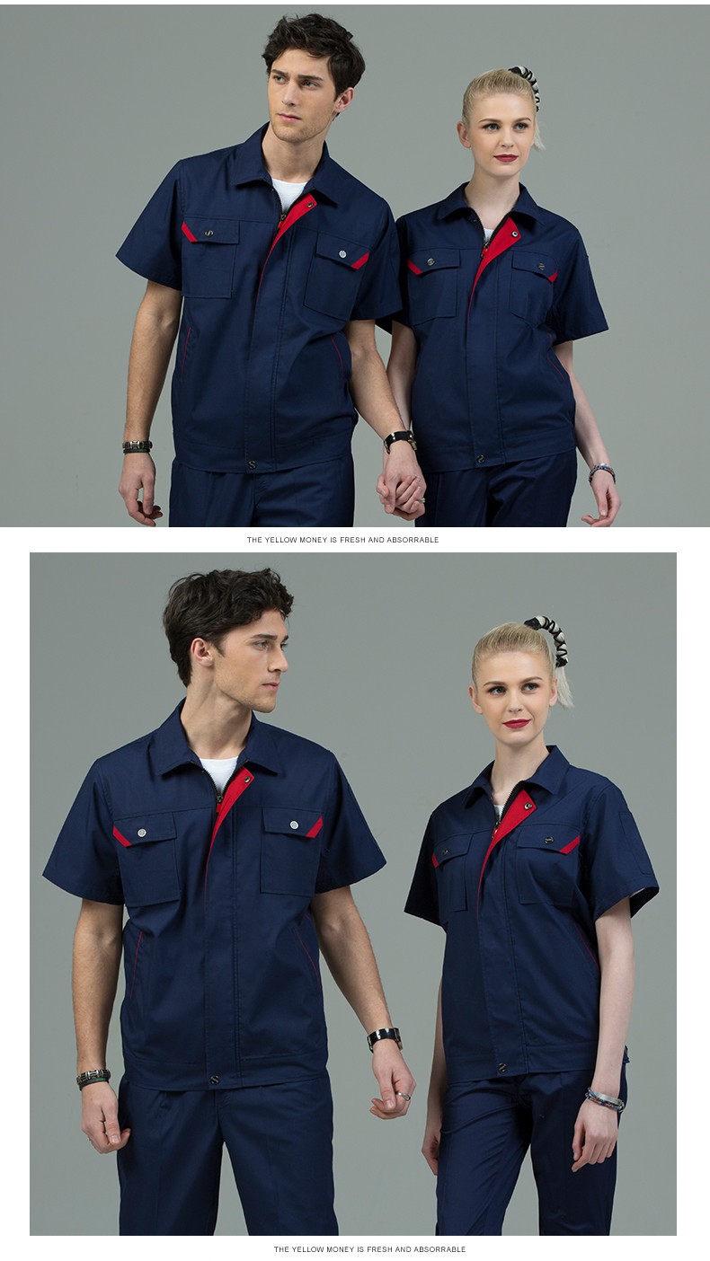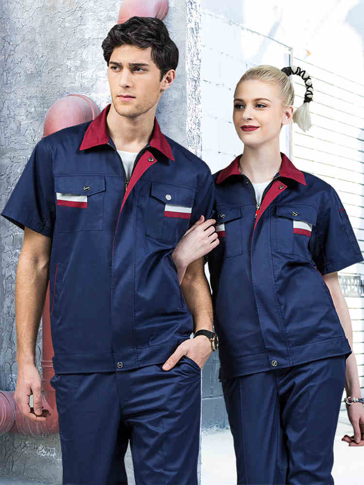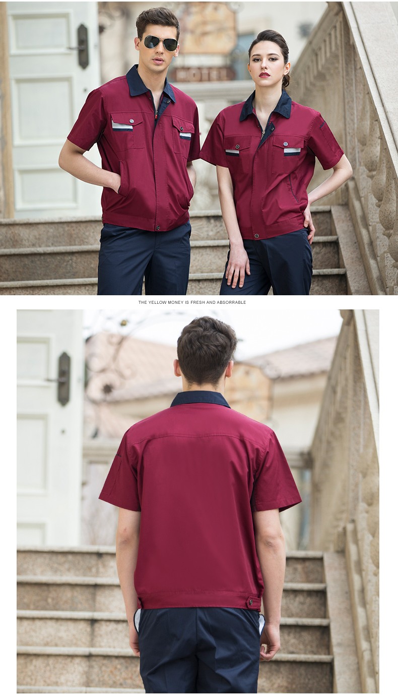 藏藍(lán)色加棗紅領(lǐng)短袖工作服,適用于物流運輸,建筑工地,工廠車間等工作環(huán)境